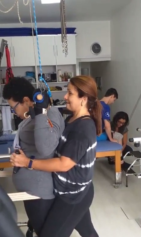 Imagem: Nilma Palmeira de Melo (à esquerda) na sessão de fisioterapia em que ficou em pé pela primeira vez após o acidente (Print de vídeo de arquivo pessoal)