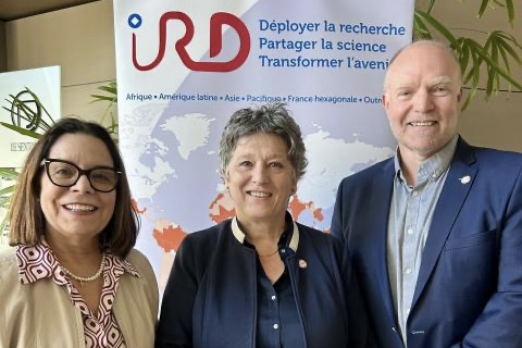 Imagem: Denise Pires de Carvalho com a CEO do IRD, Valérie Verdier, e o vice-presidente do Conselho Científico do IRD, Laurent Dagorn (Divulgação/IRD)