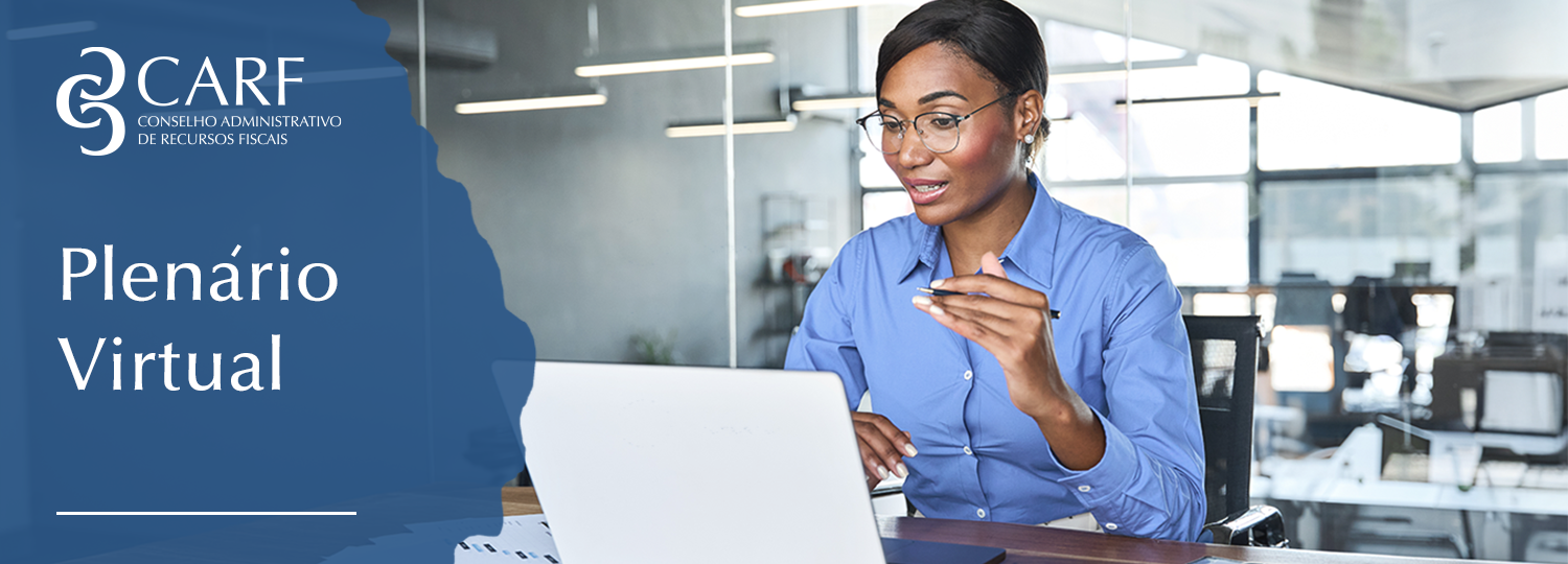 Pessoa em reunião virtual no Plenário Virtual do CARF, com laptop e caneta.