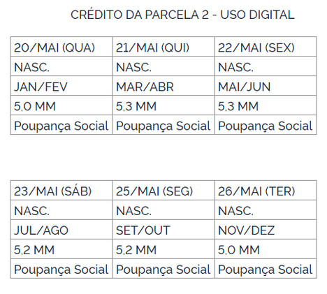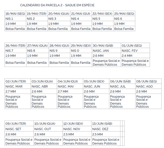 O calendário divulgado vale apenas para quem recebeu a primeira parcela até 30 de abril. Quem teve a conta digital aberta pela Caixa Econômica Federal começa a receber na quarta-feira (20/5), de acordo com a data de nascimento. Os saques em espécie só poderão ser feitos a partir de 2 de junho, também seguindo o mês nascimento.