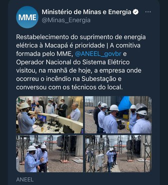 Para a assegurar que as ações necessárias estão sendo adotadas de forma diligente e rápida, o Ministro Bento Albuquerque, e os membros do gabinete de crise estão em Macapá para avaliar a situação do abastecimento energético do estado e buscar as linhas de ação para o restabelecimento da alimentação elétrica.