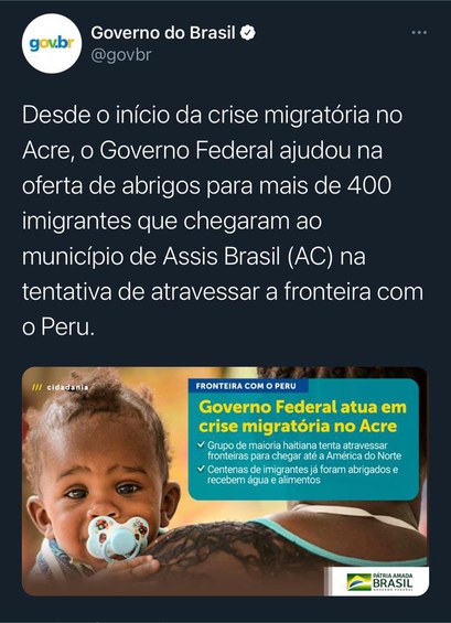 Para minimizar os impactos da crise migratória ocorrida no Acre (AC), o Governo Federal tem prestado apoio aos imigrantes que tentam atravessar a fronteira do Brasil para o Peru, com destino ao México e depois aos Estados Unidos. Desde o início da crise, a Secretaria de Governo da Presidência da República (Segov), por intermédio da Secretaria Especial de Assuntos Federativos, vem funcionando como elo de ligação entre os Entes Federativos e o Comitê de Crise, possibilitando maior agilidade às tratativas dos casos de enfrentamento dessa emergência.