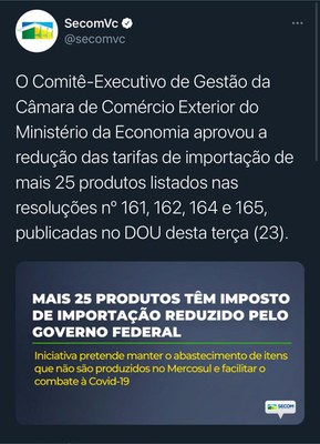 Comitê-Executivo de Gestão (Gecex), núcleo colegiado da Câmara de Comércio Exterior (Camex) do Ministério da Economia, aprovou nessa terça-feira (23) a redução das tarifas de importação de mais 25 produtos. As alterações do Imposto de Importação abrangem itens listados em quatro resoluções publicadas no Diário Oficial da União.