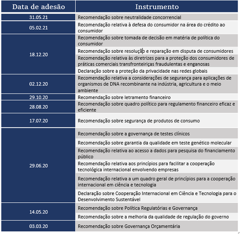 Com a aprovação da recomendação sobre neutralidade concorrencial, o Brasil completa 100 instrumentos aderidos , com mais de 40% de aderência ao acervo de normas da OCDE. Desde dezembro de 2019, já foram 35 novos instrumentos aprovados, o que evidencia o intenso processo de aproximação e convergência com os padrões e referências da Organização. Atualmente, o Brasil é o país não membro com maior número de instrumentos aprovados, mesmo entre os parceiros-chave da OCDE (além do Brasil, Índia, Indonésia, China e África do Sul).