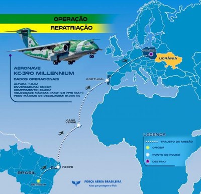 O avião KC-390 Millennium decola de Brasília, às 15 horas, com chegada a Varsóvia prevista para quarta-feira (9). No percurso, devem ser realizadas paradas técnicas, em Recife (PE), na Ilha do Sal (Cabo Verde) e em Lisboa (Portugal). O retorno do grupo de brasileiros repatriados ao Brasil está planejado para quinta-feira (10).