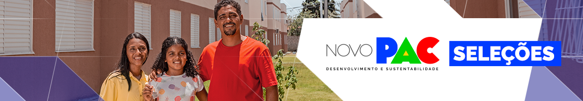 Pais e filha sorriem. Ao fundo um condomínio de apartamentos. Texto Novo PAC Desenvolvimento e sustentabilidade: seleções