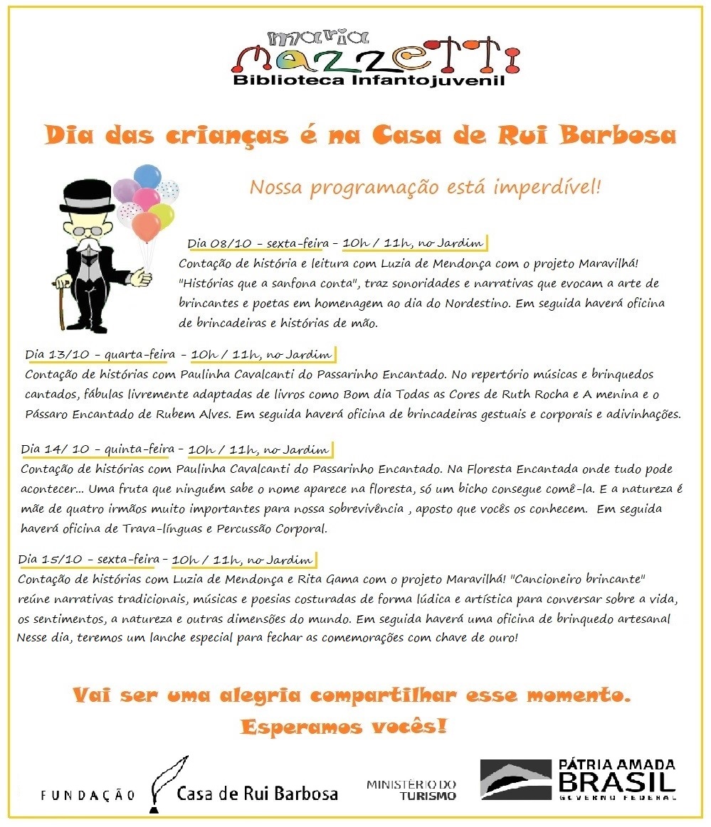 Programação para as crianças nos dias 8, 13, 14 e 15/10/2021.
