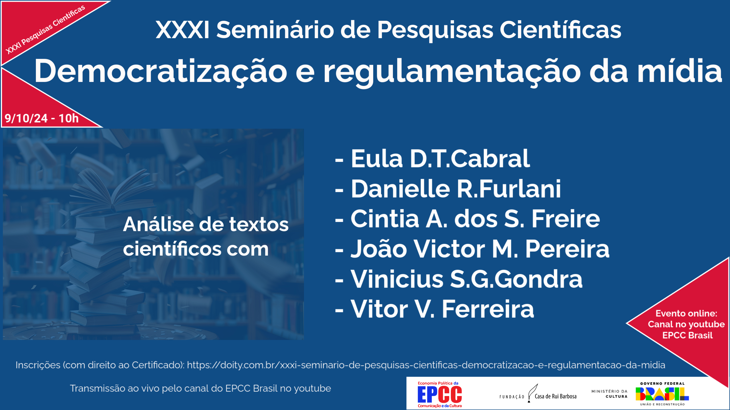 No dia 9 de outubro de 2024 (quarta-feira), às 10h, o grupo de pesquisa Economia Política da Comunicação e da Cultura (EPCC - CNPq/FCRB) realiza o XXXI Seminário de Pesquisas Científicas, analisando o tema Democratização e regulamentação da mídia.