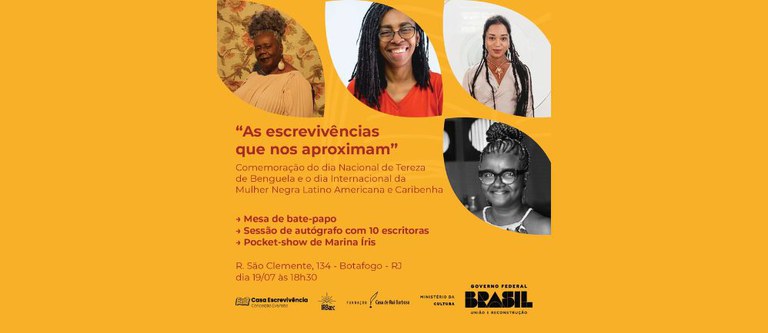 Em homenagem ao Dia de Tereza de Benguela (25 de julho), que também é o Dia da Mulher Negra Latino-Americana e Caribenha, a Casa Escrevivências e o Instituto Rui Barbosa de Altos Estudos em Cultura (IRBæc) convidam para uma Roda de Conversa com as escritoras Conceição Evaristo, Jurema Werneck e Érica Malunguinho, mediadas por Fernanda Felisberto. O evento ocorrerá a partir das 18:30 desta quarta-feira, 19/7, no auditório da Fundação Casa de Rui Barbosa e poderá ser acompanhado por streaming direto pelo link: