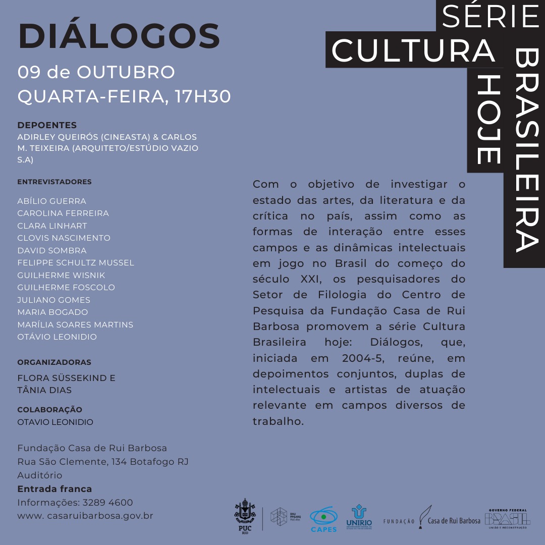 No dia 9 de outubro de 2024, às 17h30, a Fundação Casa de Rui Barbosa promove mais um evento da série "Cultura Brasileira Hoje: Diálogos".