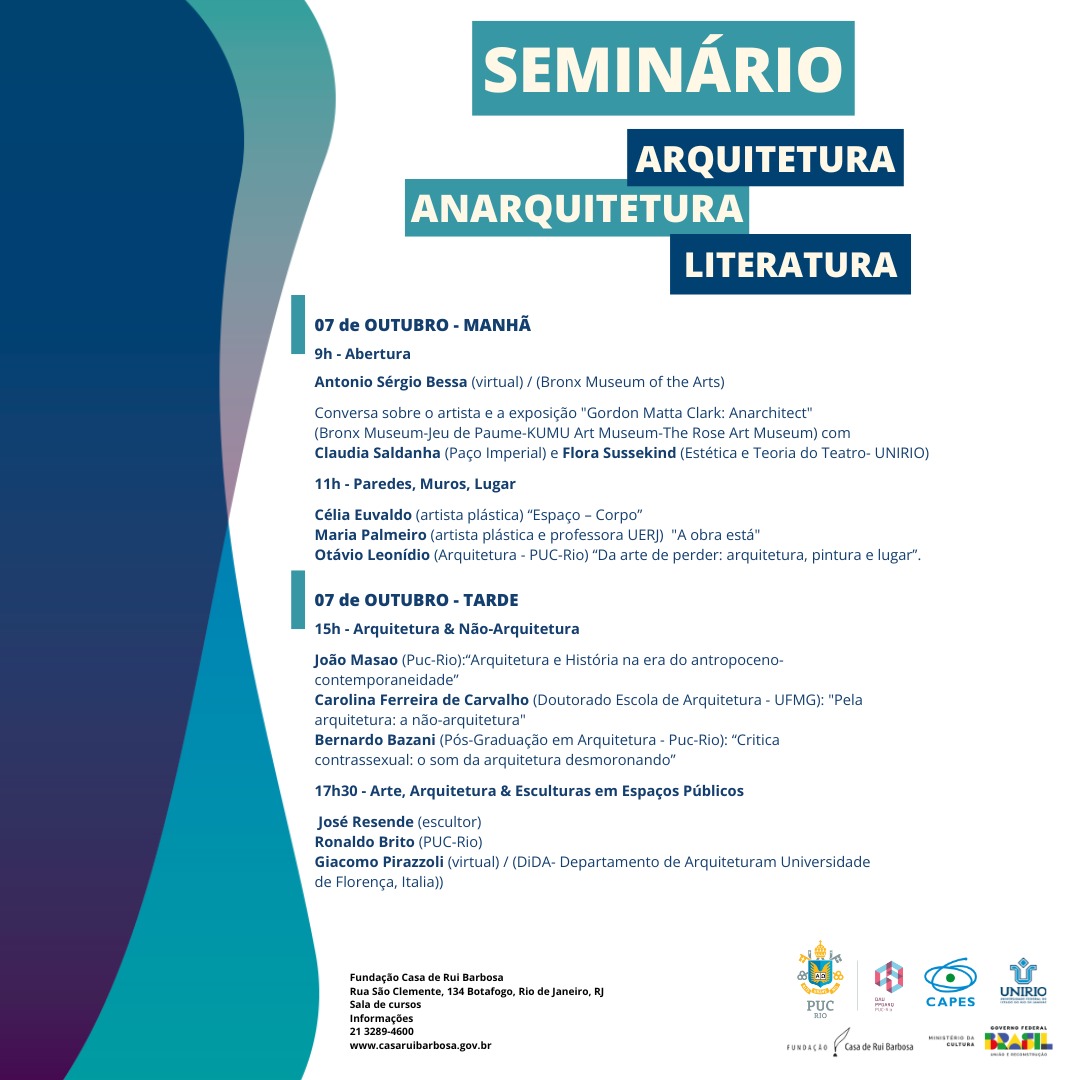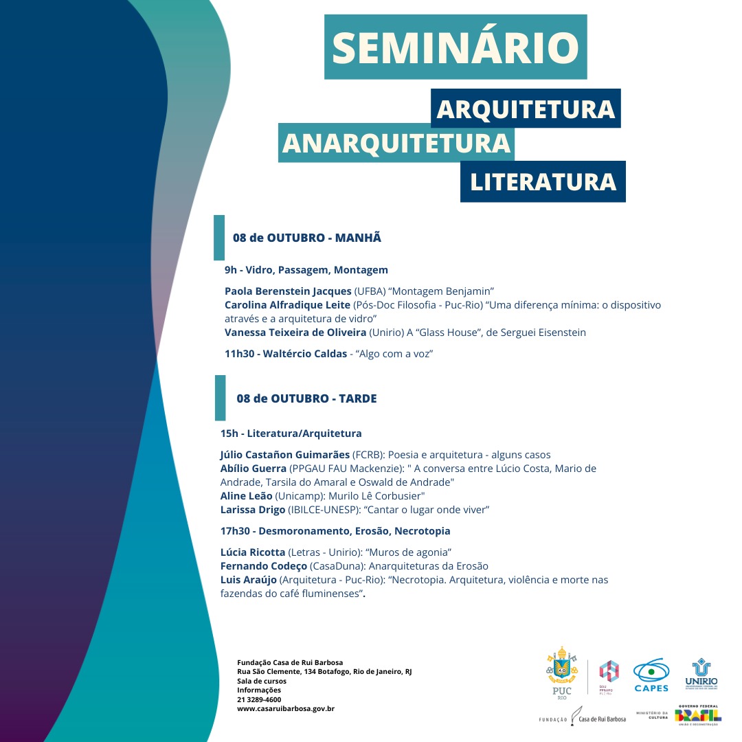 Nos dias 7, 8 e 9 de outubro de 2024, de 9h às 20h, a Fundação Casa de Rui Barbosa (FCRB) promove o Seminário internacional "Arquitetura, Anarquitetura e Literatura". Com a presença de especialistas, o evento acontece na Sala de Cursos, localizada na Rua São Clemente 134 - Botafogo (RJ - RJ). Para os que se inscreverem e assinarem a lista de presença no local, serão enviados os Certificados.