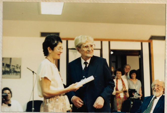 Neusa Amato entregando diploma de Professor Emérito a Oliveira Castro em 1991