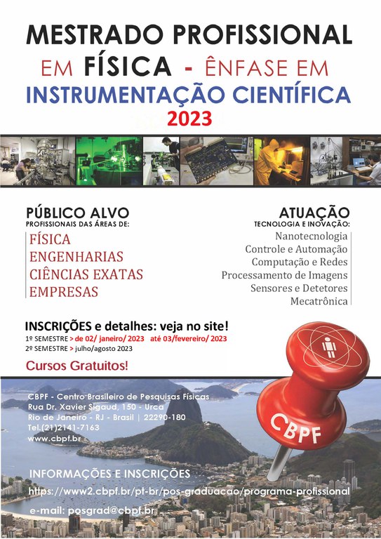 Estão abertas as inscrições do processo seletivo para o primeiro semestre do Mestrado Profissional em Física em ênfase em Instrumentação Cientifica, do Centro Brasileiro de Pesquisas Físicas (CBPF), no Rio de Janeiro.