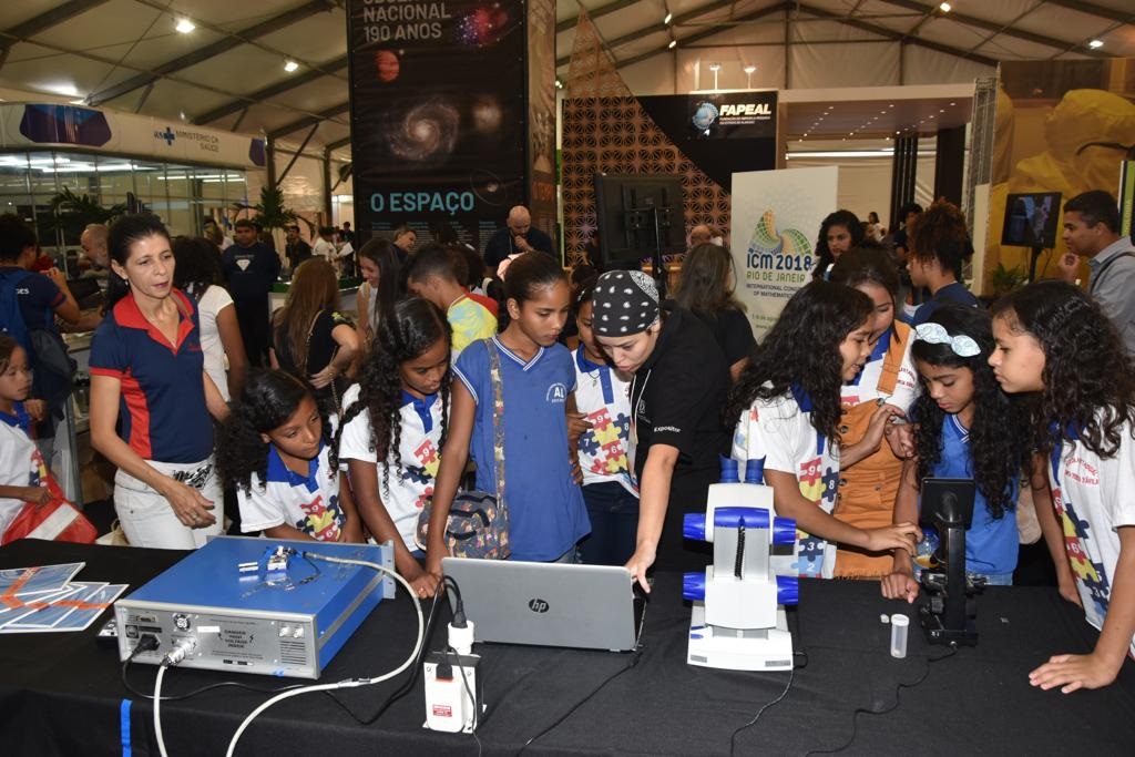 A pós-graduanda do CBPF Jade Barreto (centro, camiseta preta) e alunos no estande da SBPC em Maceió