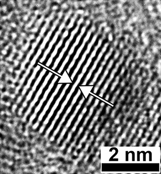 Nanopartícula magnética; as setas indicam o plano cristalino da SPION.