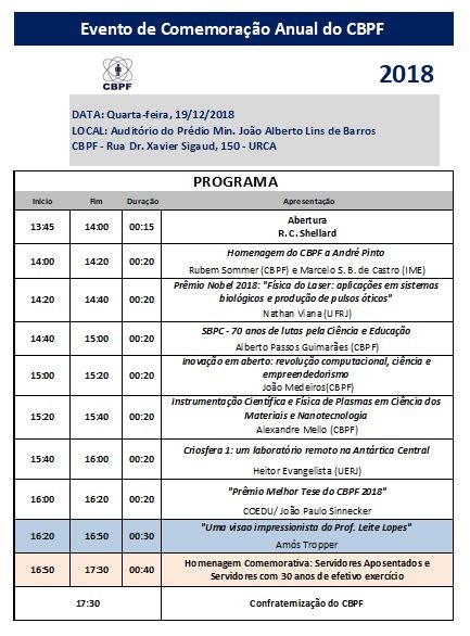 Amanhã (19/12), acontece a 'Comemoração Anual do CBPF’, confraternização que marca o encerramento do ano no Centro Brasileiro de Pesquisas Físicas (CBPF), no Rio de Janeiro (RJ). A programação inclui homenagens, palestras variadas – do tema premiado pelo Nobel de Física deste ano ao empreendedorismo entre jovens cientistas – e a entrega do ‘Prêmio Melhor Tese do CBPF 2018’. A comemoração acontece no auditório Ministro João Alberto Lins de Barros, a partir das 13h45, com abertura feita pelo físico experimental e diretor do CBPF, Ronald Cintra Shellard.