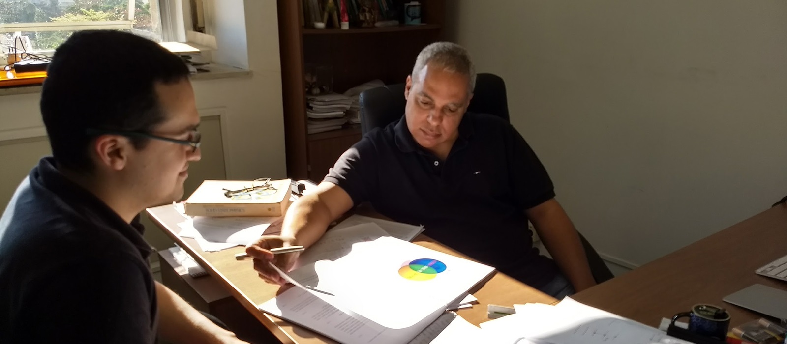 Peterson (esq.) e seu orientador, Sarthour, discutem detalhes da tese