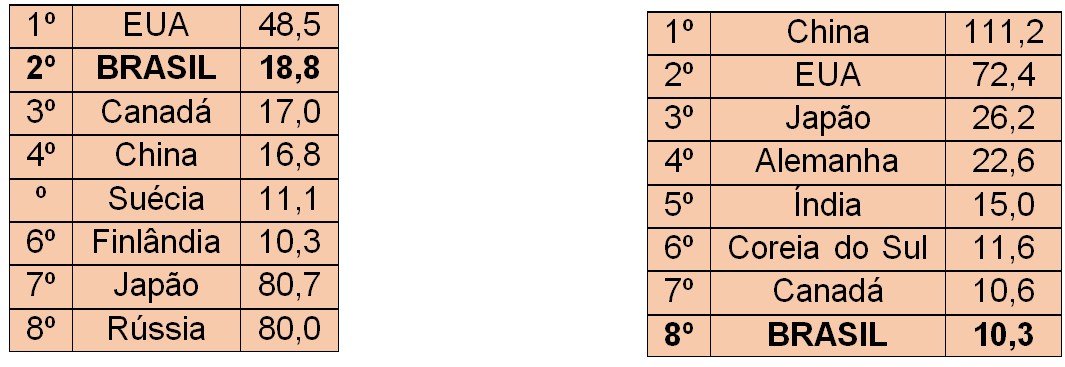 Nossa silvicultura concentra-se principalmente no cultivo de eucalipto (75,2%) e de pinus (20,6%) ‒ que são usados majoritariamente para produção de carvão vegetal (12,4%) e de celulose ‒ e abrange as regiões do Cerrado e da Mata Atlântica. O Brasil foi, em 2016, o 2º maior produtor mundial de celulose, mas apenas o 8º produtor mundial de papel (figura 2) .