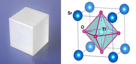 Cristal sintético puro de SrTiO 3 (esq.); estrutura do SrTiO 3 : oxigênio, titânio e estrôncio