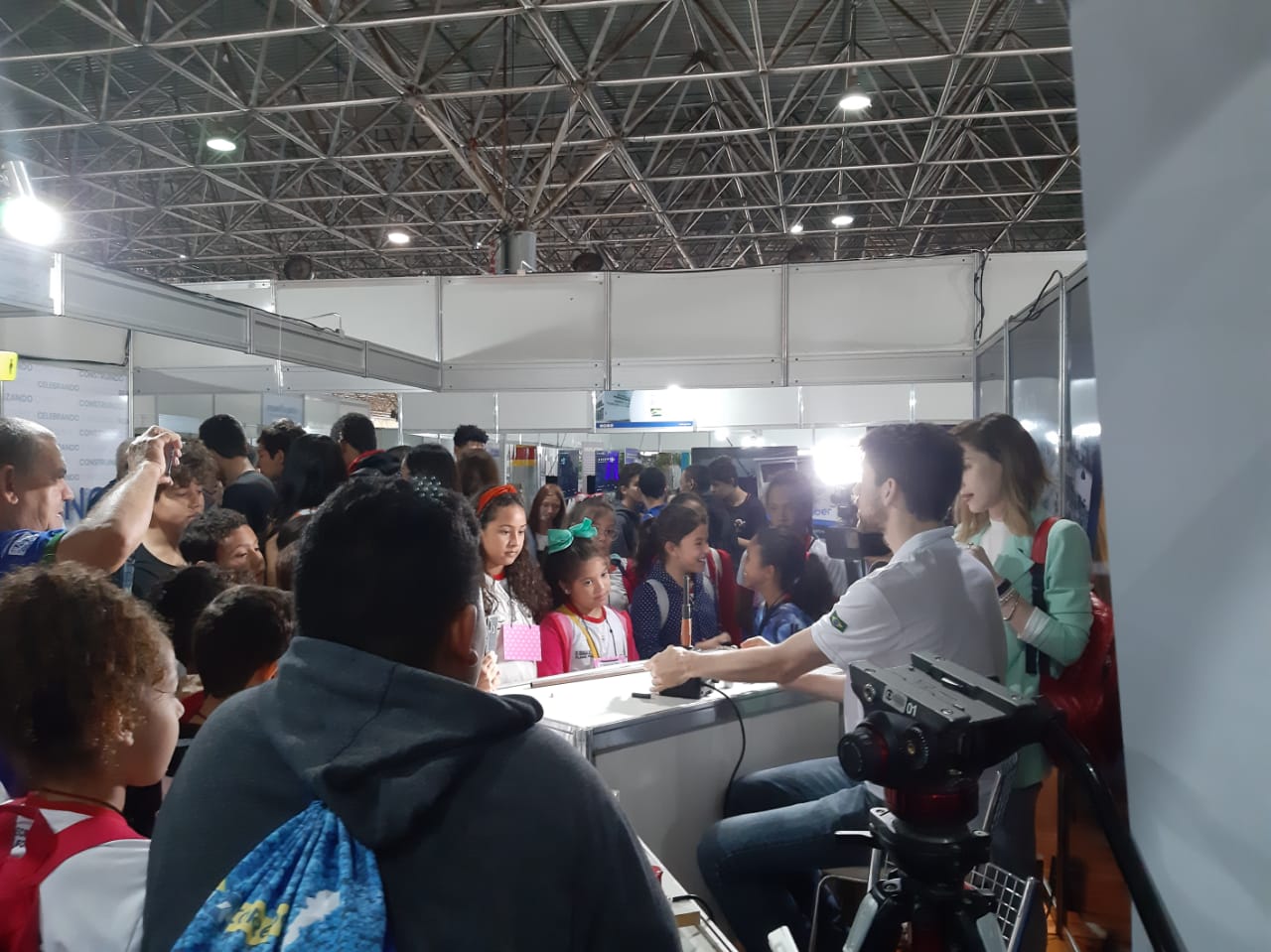 Estande do CBPF durante visita de estudantes e gravação de reportagem
