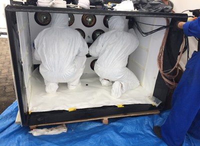 Contêiner onde está o detector completo; sensores de luz sendo fixados no interior do detector