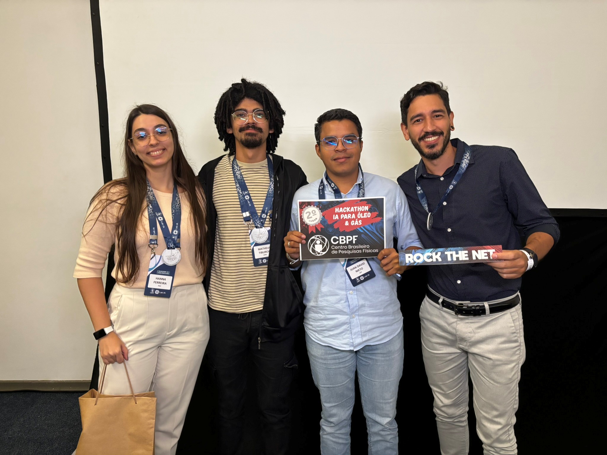 - Grupo EntropIA (da esq. para a dir.): Gustavo Damasceno; André Gualberto; Gabriella Araujo; Charlie Sarmiento - Crédito: NCS/CBPF