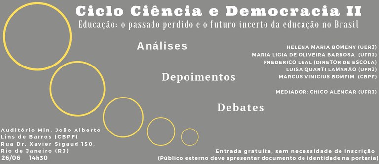 Nesta quarta-feira (26/06), a partir das 14h30, o ‘Ciclo Ciência e Democracia’ terá sua segunda edição, com tema que é outro problema crônico brasileiro: educação. O evento, que ocorre no Centro Brasileiro de Pesquisas Físicas (CBPF), no Rio de Janeiro (RJ), terá, mais uma vez, participação de acadêmicos e contará com depoimentos.