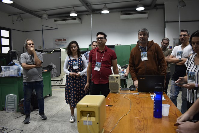 Professores na oficina mecânica do CBPF confeccionando experimentos de baixo custo