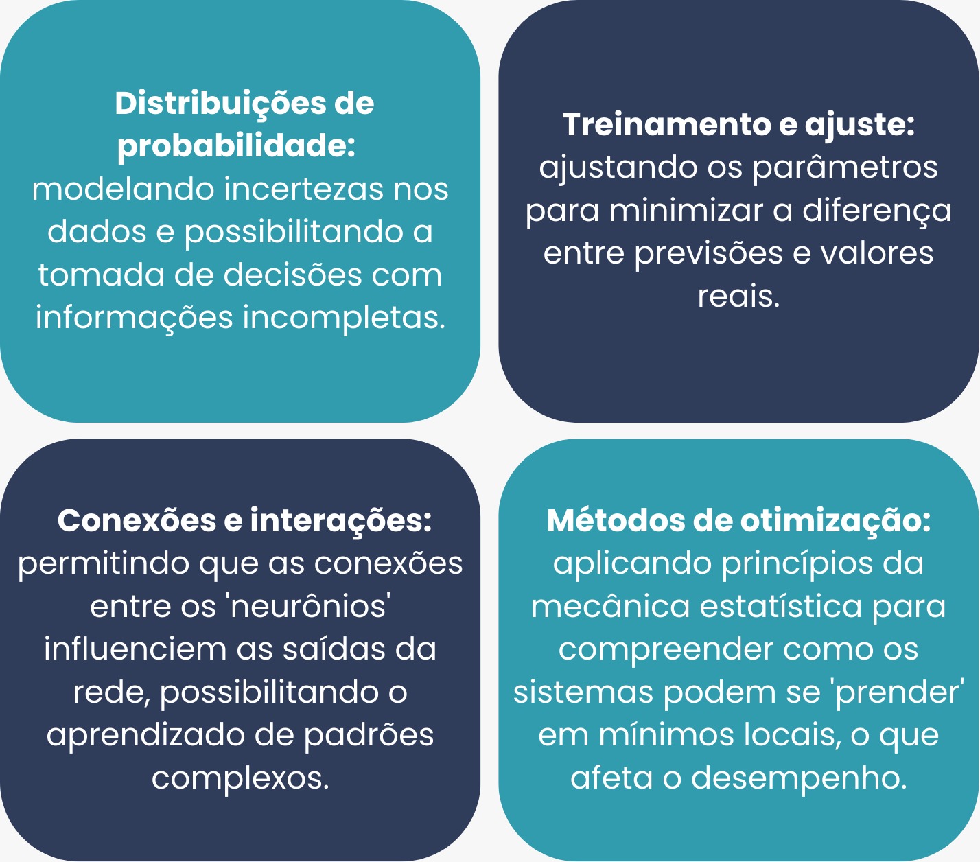 A mecânica estatística é essencial para o estudo de sistemas complexos, usando probabilidades para descrever comportamentos coletivos. Esse conceito foi adaptado às redes neurais e a inteligência artificial, especialmente nas áreas de: