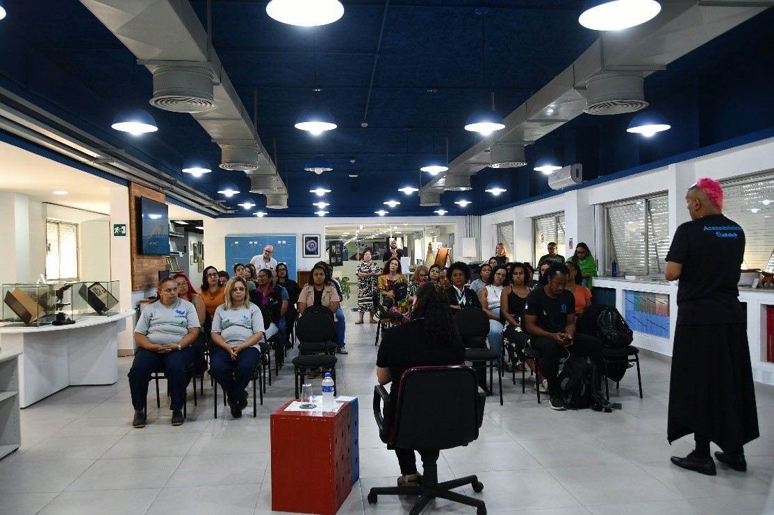 A palestra, “Inclusão e Acessibilidade na Educação Pública”, ministrada por Patrícia Ignácio da Rosa (Instituto Benjamin Constant - IBC), trouxe um relato da trajetória profissional da professora e seus desafios na busca por promover um ambiente mais pertencente aos seus alunos com eficiência. A atividade foi seguida por uma roda de conversa sobre “Inclusão e Acessibilidade nas Instituições Públicas”, contando com a participação de Janaína Candeias (Associação de Pais e Amigos dos Excepcionais - APAE Rio), Marco Sá (Setorial de Pessoas com Deficiência no município do RJ), Angélica Beta (IBC) e Mônica Ramalho (CBPF) como moderadora, que apresentaram dados e perspectivas sobre os desafios dos deficientes em uma sociedade que ainda não é plenamente preparada para eles.