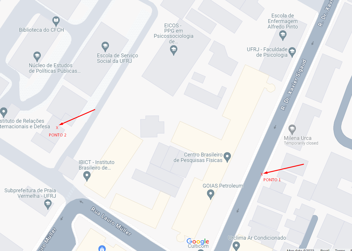 Ponto 1: Do outro lado da Rua Dr. Xavier Sigaud, 150, em frente à portaria principal do CBPF.