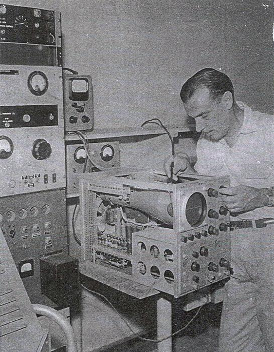 Figura: Alfredo Ventura, o primeiro técnico em eletrônica do CBPF, realizando a manutenção de um instrumento científico - um osciloscópio utilizado nos laboratórios de física experimental na década de 1960. Foto: Acervo do CBPF.
