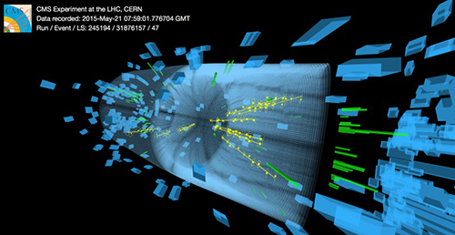 | Partículas produzidas em colisão de prótons registrada pelo detector CMS. Traços (em amarelo) indicam a passagem de partículas carregadas eletricamente. Torres (em verde e azul) fornecem medidas da energia depositada por partículas nos calorímetros do detector. (Imagem: Colaboração CMS) |