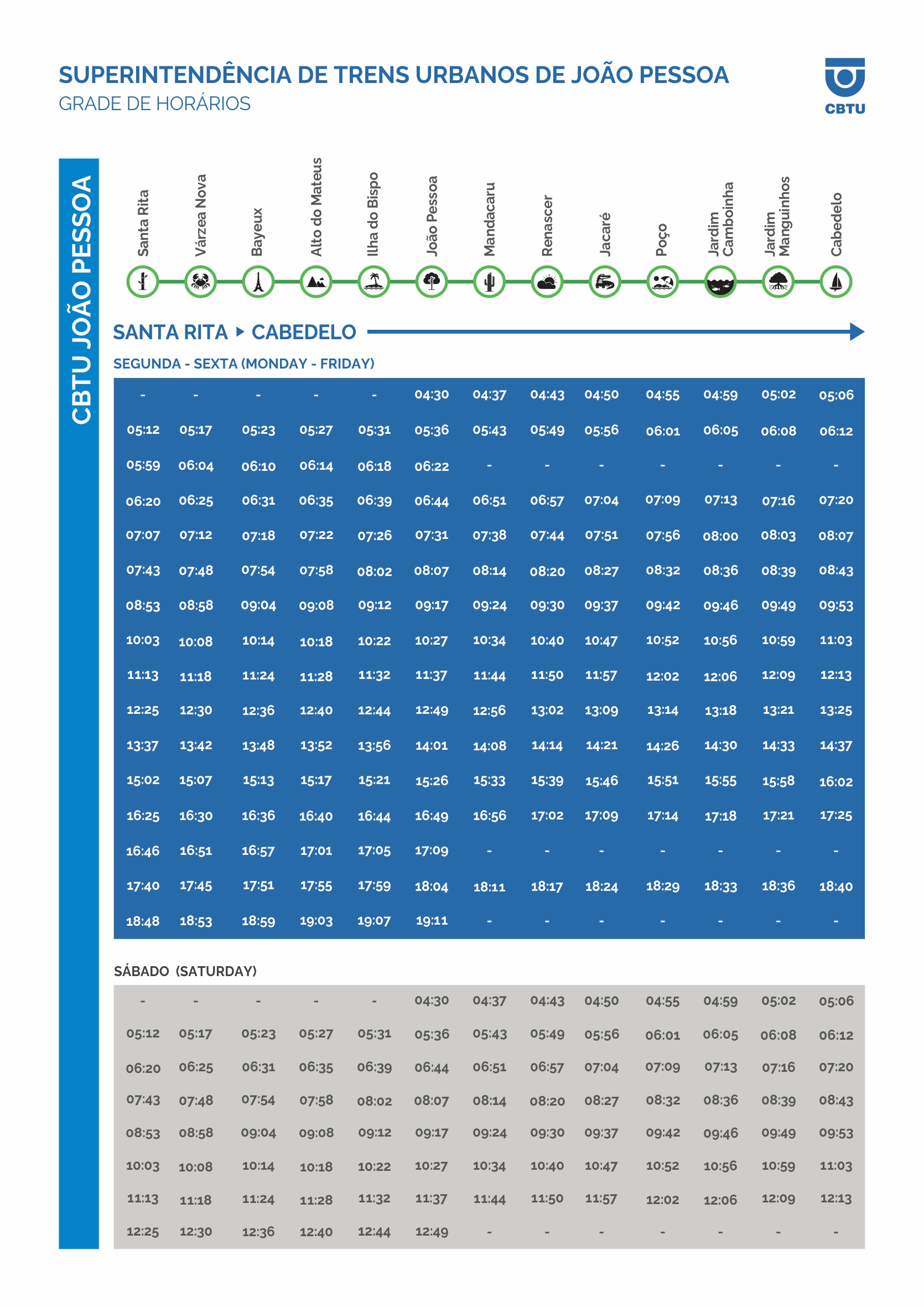 Com a ampliação dos horários, os trens começam a circular a partir das 04h30 para Cabedelo e das 04h40 para Santa Rita, encerrando as atividades às 19h23. A CBTU João Pessoa atende a população de quatro municípios da Região metropolitana da Capital – Cabedelo, João Pessoa, Bayeux e Santa Rita. O sistema local possui 13 estações distribuídas nos 30 km de ferrovia. O preço único da passagem é de R$ 2,50 que pode ser pago em através de pix – apenas na Estação João Pessoa e com dinheiro em espécie em todas as estações.