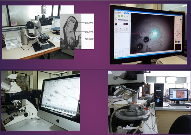- microthermometric studies of fluid inclusions in transparent and opaque minerals (using normal and infrared light platforms);