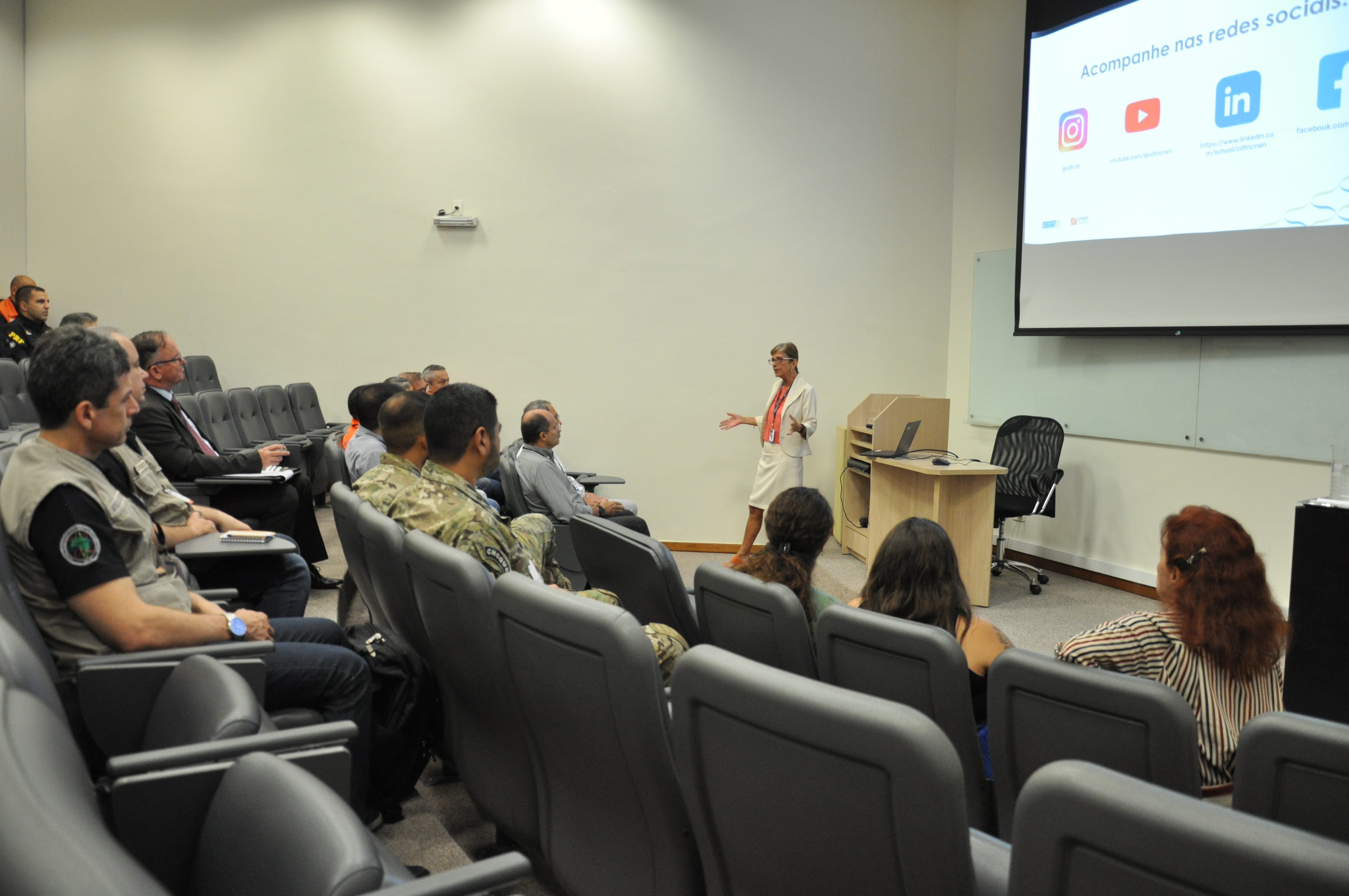 A primeira apresentação da manhã foi realizada pela chefe da Divisão de Gestão da Inovação e Serviços, Régia Guimarães, com um panorama geral sobre as atividades e os serviços oferecidos pelo CDTN. Em seguida, foi realizada a palestra da pesquisadora Clédola Cássia Tello, que apresentou o status atual e perspectivas para o projeto que coordena, o Centro Tecnológico Nuclear e Ambiental (CENTENA), futuro repositório brasileiro de rejeitos de baixo e médio níveis de radiação. As duas últimas exposições ficaram por conta do chefe da Divisão de Segurança Nuclear e Radiológica, Pablo Grossi, que apresentou um estudo de caso sobre as duas fontes radioativas extraviadas no interior de Minas Gerais e encontradas no ano passado, e da colaboradora Fernanda Camargo, que explicou sobre Materiais Radioativos de Ocorrência Natural (NORM) na indústria de petróleo.