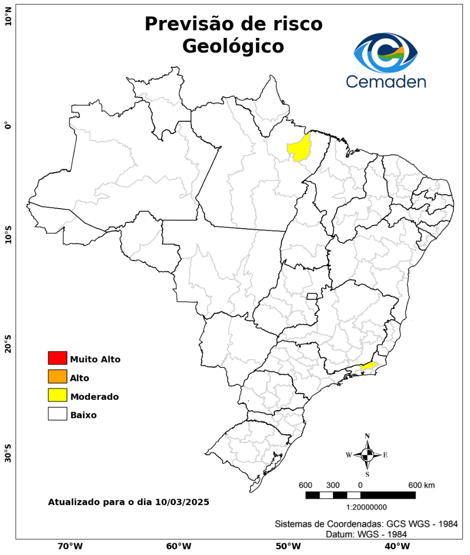 Neste sábado (10/03/2025), o cenário de risco de eventos geo-hidrológicos para as regiões do Brasil é apresentado a seguir: