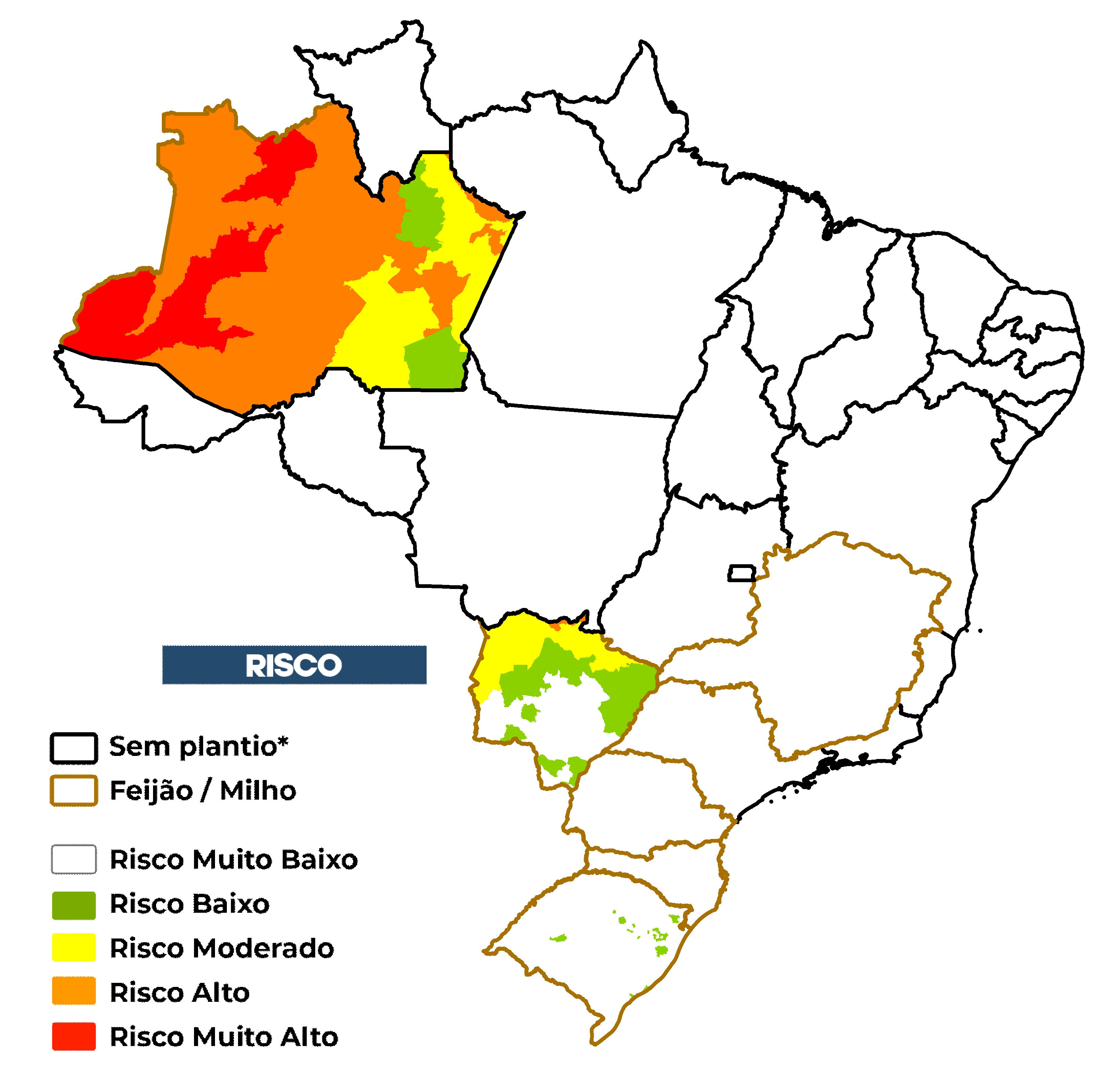 O risco de seca na agricultura familiar é avaliado considerando o cultivo de feijão e/ou milho não irrigados. O risco considera a exposição ao déficit hídrico associada às vulnerabilidades e capacidades adaptativas de cada município em relação ao sistema de agricultura familiar. Além disso, é utilizado o calendário agrícola disponibilizado pela CONAB*.