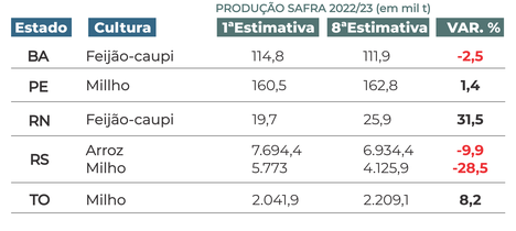 Na primeira estimativa de outubro de 2022 para a safra de grãos 2022/23 previa-se uma produção total de 312,4 milhões de toneladas. A estimativa atual indica a produção de 313,8 milhões de toneladas, comparativamente à primeira estimativa, observa-se aumento de 0,5%.