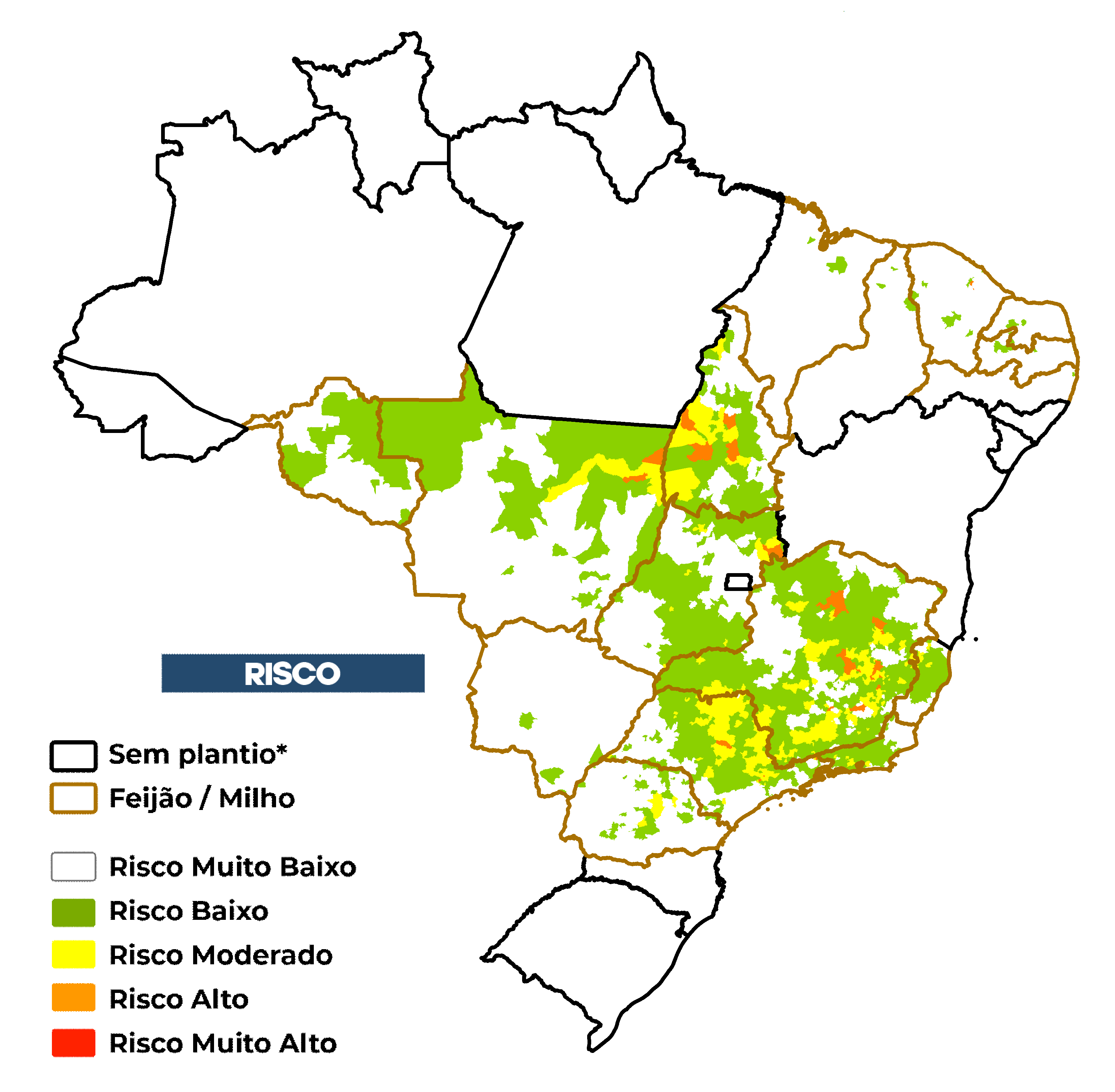 O risco de seca na agricultura familiar é avaliado considerando o cultivo de feijão e/ou milho não irrigados. O risco considera a exposição ao déficit hídrico associada às vulnerabilidades e capacidades adaptativas de cada município em relação ao sistema de agricultura familiar. Além disso, é utilizado o calendário agrícola disponibilizado pela CONAB*.