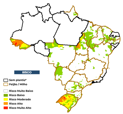 O risco de seca na agricultura familiar é avaliado considerando o cultivo de feijão e/ou milho não irrigados. O risco considera a exposição ao déficit hídrico associada às vulnerabilidades e capacidades adaptativas de cada município em relação ao sistema de agricultura familiar. Além disso, é utilizado o calendário agrícola disponibilizado pela CONAB*.