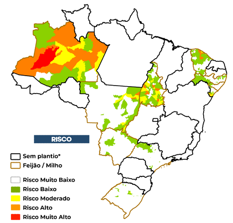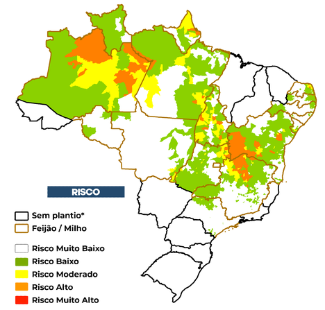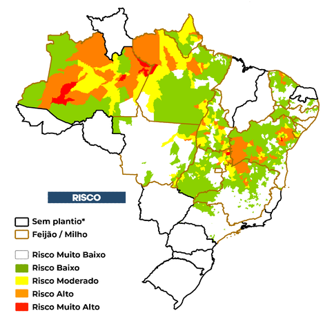 O risco de seca na agricultura familiar é avaliado considerando o cultivo de feijão e/ou milho não irrigados. O risco considera a exposição ao déficit hídrico associada às vulnerabilidades e capacidades adaptativas de cada município em relação ao sistema de agricultura familiar. Além disso, é utilizado o calendário agrícola disponibilizado pela CONAB*.