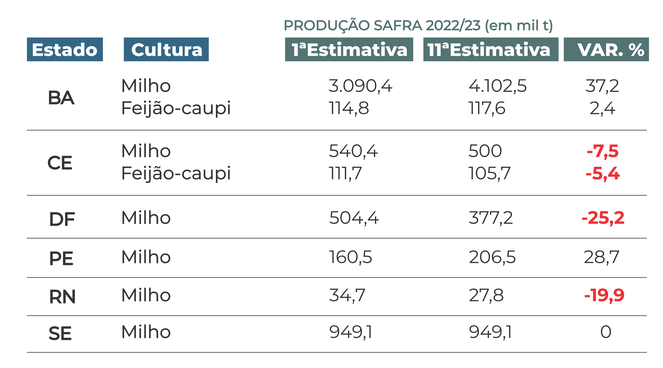 Distrito Federal: a colheita atingiu 30% da área onde o milho foi semeado. Durante as últimas semanas, notou-se uma escassez de água e um intenso ataque de cigarrinhas, o que levou a uma diminuição na estimativa de produtividade em comparação com a análise anterior.