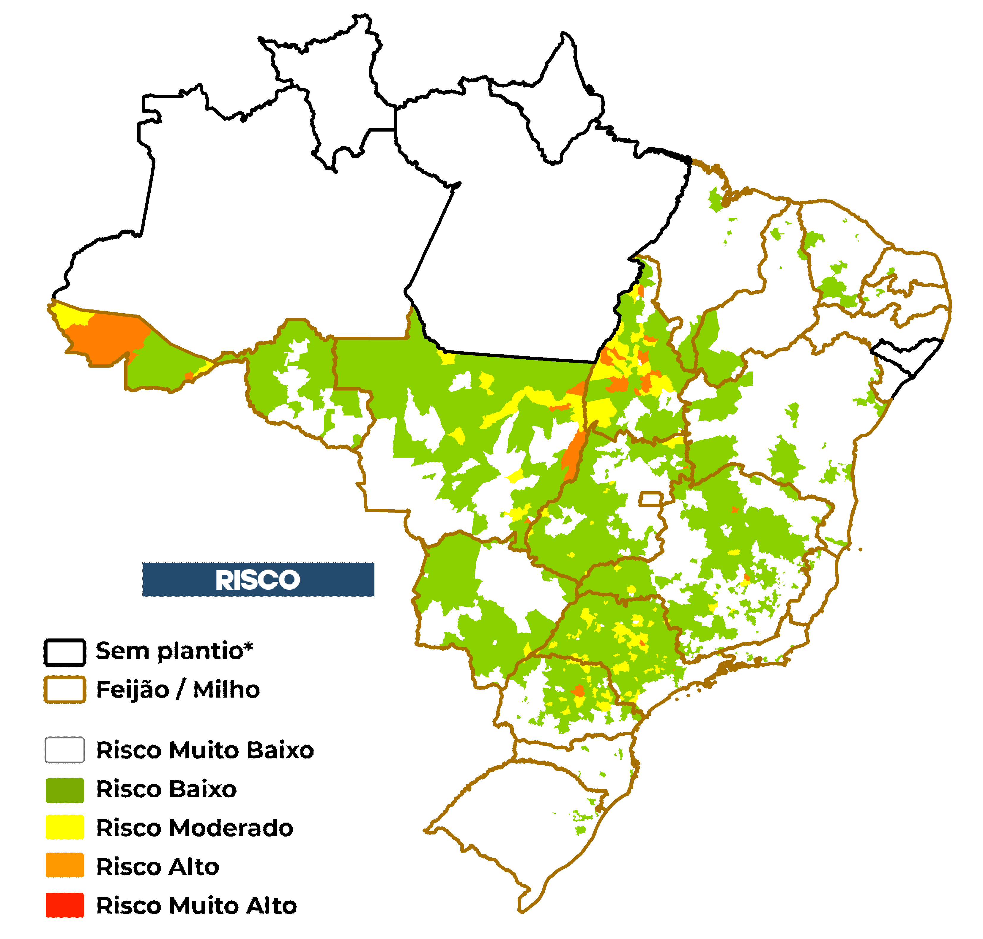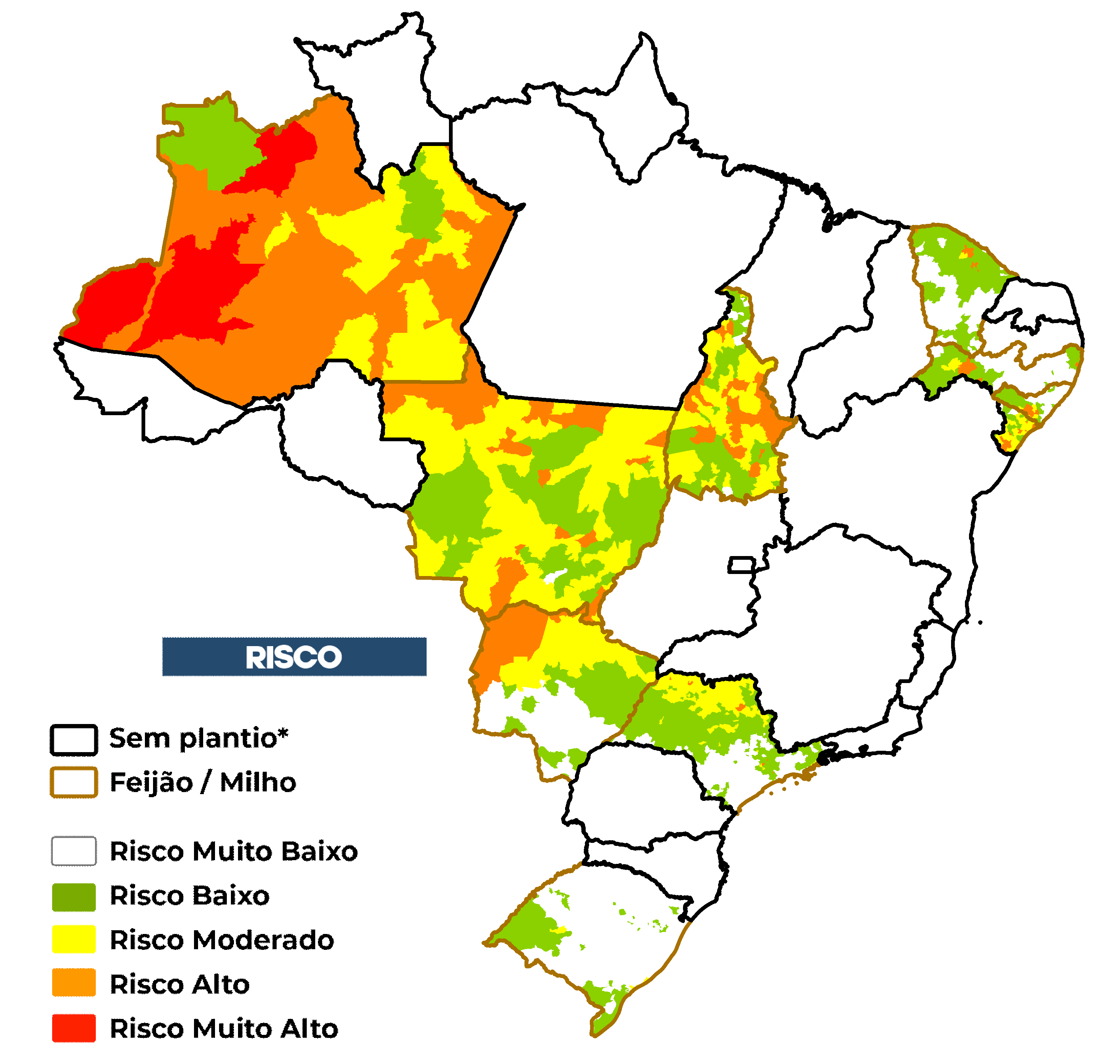 O risco de seca na agricultura familiar é avaliado considerando o cultivo de feijão e/ou milho não irrigados. O risco considera a exposição ao déficit hídrico associada às vulnerabilidades e capacidades adaptativas de cada município em relação ao sistema de agricultura familiar. Além disso, é utilizado o calendário agrícola disponibilizado pela CONAB*.