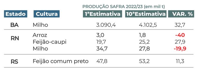 Apesar do aumento no volume de produção, alguns estados relataram impactos devido ao déficit hídrico. A Tabela 1 indica os estados, as culturas impactadas e a variação da produção estadual estimada em março comparado com a primeira estimativa. Além da seca, outros fatores como a diminuição ou o aumento da área semeada, migração para culturas mais rentáveis e a infestação de pragas podem influenciar na variação na produção.