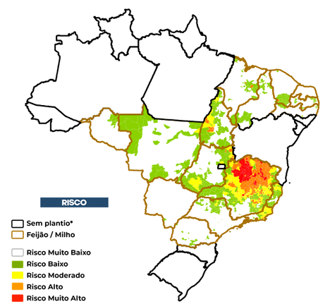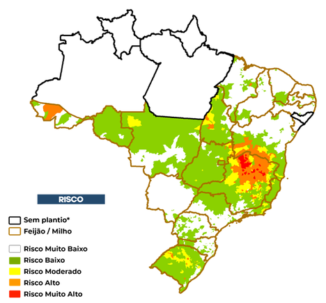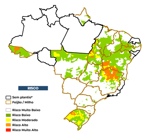 O risco de seca na agricultura familiar é avaliado considerando o cultivo de feijão e/ou milho não irrigados. O risco considera a exposição ao déficit hídrico associada às vulnerabilidades e capacidades adaptativas de cada município em relação ao sistema de agricultura familiar. Além disso, é utilizado o calendário agrícola disponibilizado pela CONAB*.