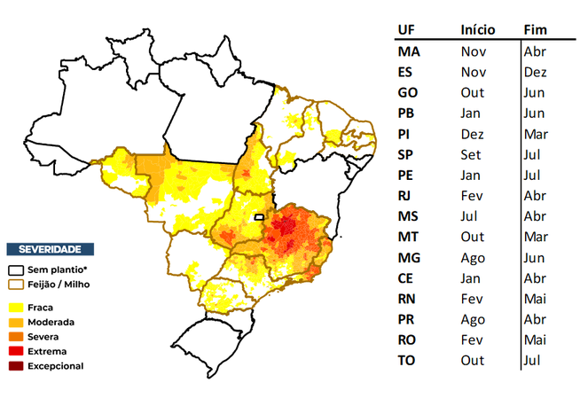 Minas Gerais: o feijão-comum cores , em algumas localidades dos municípios da região Noroeste e Alto Paranaíba, tem enfrentado períodos mais prolongados de estiagem, variando de 10 a 15 dias, gerando preocupação com relação ao seu potencial produtivo. No caso do milho , as plantações semeadas fora da janela encontram-se em alerta, já que em determinadas regiões já há escassez de água, prejudicando os tratos culturais, especialmente a adubação de cobertura.