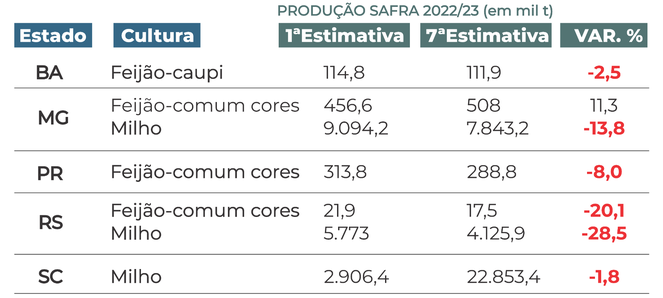 Apesar do aumento no volume de produção, alguns estados relataram impactos devido ao déficit hídrico. A Tabela 1 indica os estados, as culturas impactadas e a variação da produção estadual estimada em março comparado com a primeira estimativa. Além da seca, outros fatores como a diminuição ou o aumento da área semeada, migração para culturas mais rentáveis e a infestação de pragas podem influenciar na variação na produção.