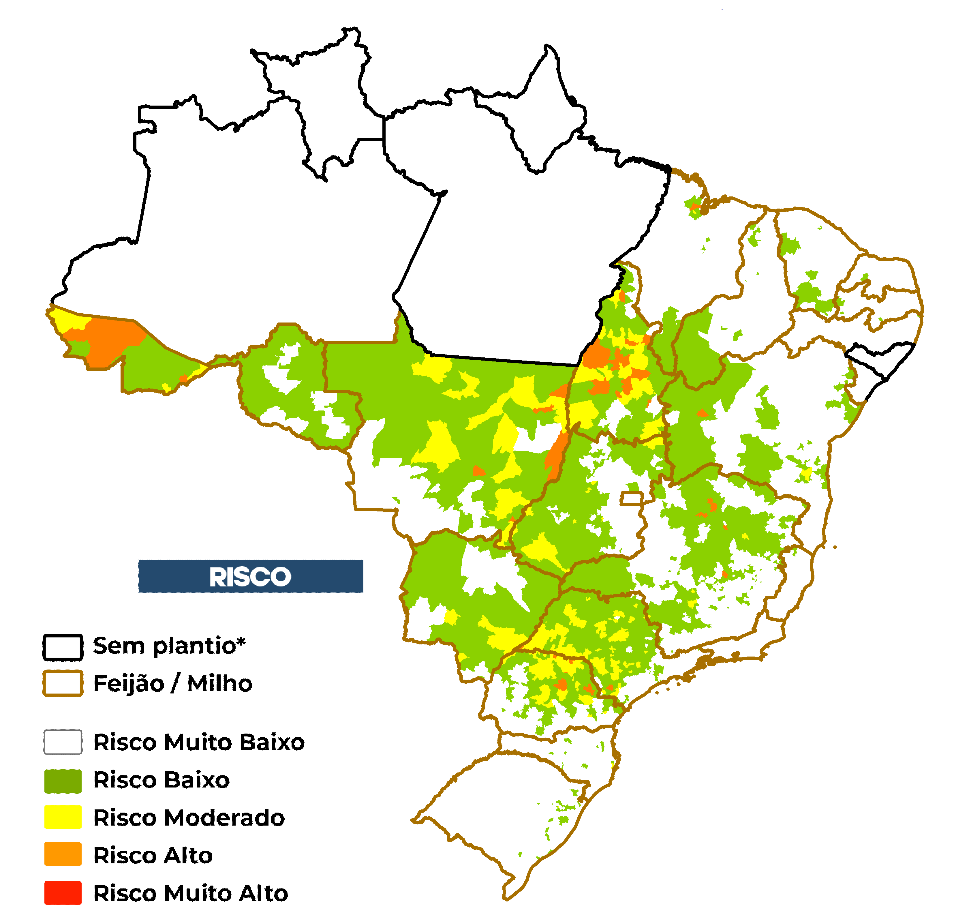 O risco de seca na agricultura familiar é avaliado considerando o cultivo de feijão e/ou milho não irrigados. O risco considera a exposição ao déficit hídrico associada às vulnerabilidades e capacidades adaptativas de cada município em relação ao sistema de agricultura familiar. Além disso, é utilizado o calendário agrícola disponibilizado pela CONAB*.