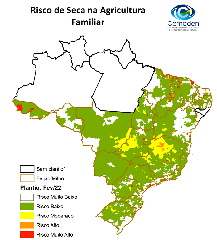 O mapa de risco de seca para a agricultura familiar é elaborado mensalmente a partir das variáveis físicas de ameaça de seca, tais como o déficit de precipitação, umidade do solo e índice de vigor vegetativo, combinadas com informações sobre as vulnerabilidade e capacidades locais da agricultura familiar.